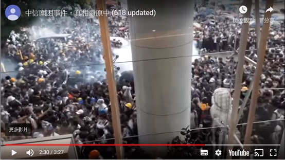 警方曾就當日民陣於金鐘舉辦的和平集會發出不反對通知書,而事發地點龍匯道南面行人路屬不反對通知書範圍之內。但警方依然在中信大廈外使用催淚彈清場,而且施放前沒有作任何警告。從影片1分33秒處可見,中信大廈外左方有警員發射催淚彈。。由於右方設有警方防線,示威者只能走入中信大廈,沒有其他通道離開。