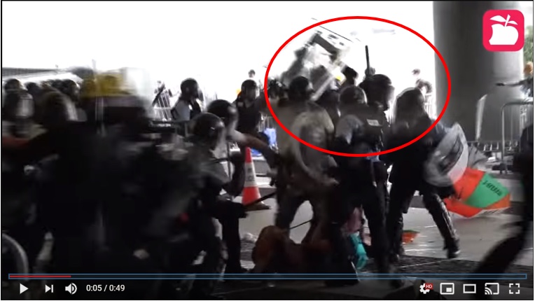 從影片可見,女示威者倒地後雙手抱頭,在手上沒有武器的情況下,被至少4名警員繼續手持警棍攻擊。其後,一名警員高舉盾牌,將其大力壓向女示威者。女示威者手無寸鐵,倒地後並無還擊,亦未作任何反抗,最後卻被警員毆打。這涉嫌違反《公安條例》第17條中,表明警務人員在阻止公眾聚集舉行,或停止或解散公眾聚集時,只可以使用「合理所需的武力」。而過份武力對待被拘捕人士,在沒有合理辨解下,亦可能違反《侵害人身罪條例》各 ...