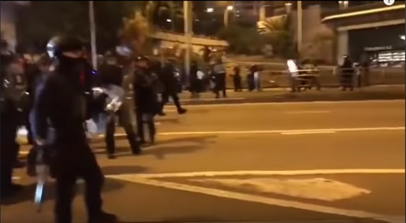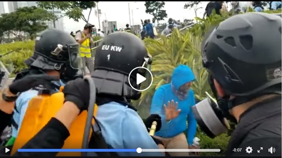 (a)(b)警方向夏慤道人群發放催淚彈。從影片可見,於約4時15分,一名身穿棕色衣服的男子在只是站在速龍小隊前方、未作任何攻擊性行為及未威脅到任何警隊成員安全的情況下,被速龍小隊拉倒並毆打。這涉嫌違反《公安條例》第17條中,表明警務人員在阻止公眾聚集舉行,或停止或解散公眾聚集時,只可以使用「合理所需的武力」。而過份武力對待被拘捕人士,在沒有合理辨解下,亦可能違反《侵害人身罪條例》各條。