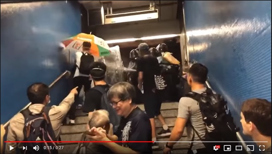 從影片中可見,警員罔顧地鐵站樓梯後已屬於室內地方,在金鐘地鐵站C出口附近放煙霧彈,迫使市民走進地鐵站。期間,有市民拉回一名女士向後退,顯然已有離開意欲,警員卻處處逼進,甚至直接在站內使用胡椒噴霧攻擊示威人士及市民。這涉嫌違反《公安條例》第17條中,表明警務人員在阻止公眾聚集舉行,或停止或解散公眾聚集時,只可以使用「合理所需的武力」。