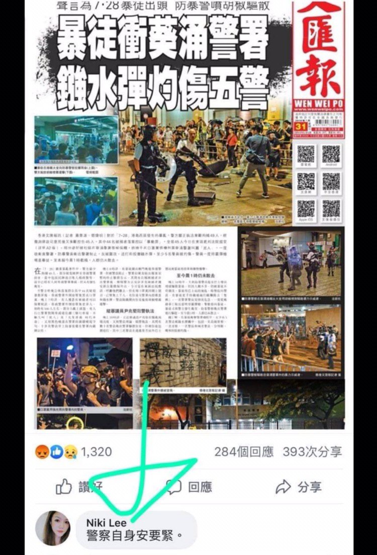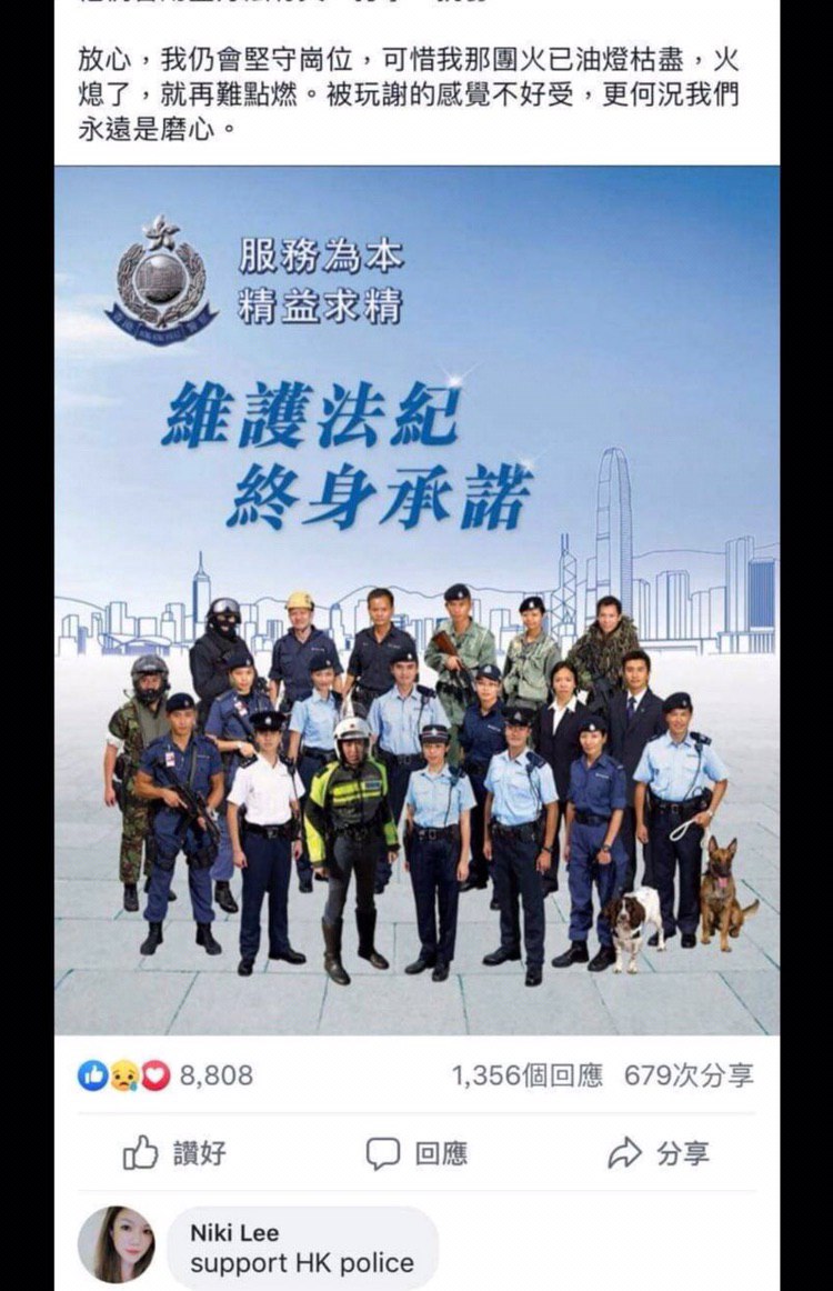 佢曾經係Facebook轉發支持香港警察嘅言論,詳見下圖:
