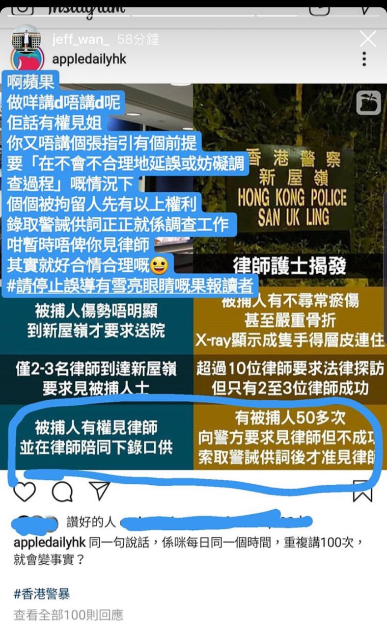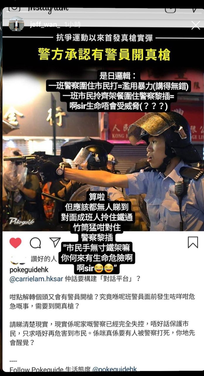 佢由6月9日已經不停鬧示威者,話佢都想參與遊行,不過係着住藍色衫(即係想做警察),又支持警察剝奪被捕者應有權利。