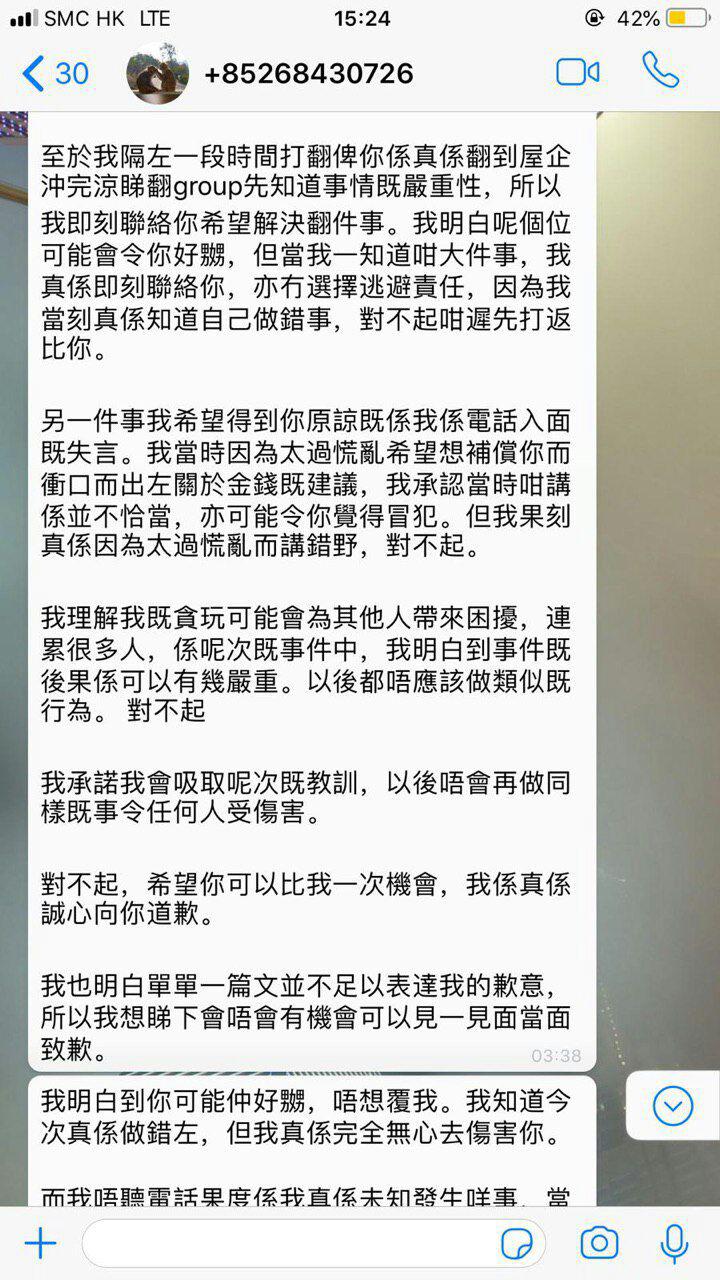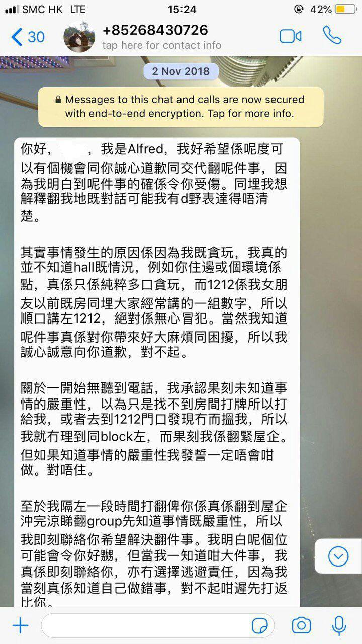 據讀者資料,佢係大學時就多次聲稱要做警察,考咗兩至三年先成功入選。係大學住宿時多次做過火行為,包括係沙灘公然除褲,以及故意入女性房間睇人裸體,然後係WhatsApp群組大肆宣揚,導致再有一個人打開該房房間睇受害人。詳細情形可以參考下方WhatsApp對話紀錄(第二張圖開始):