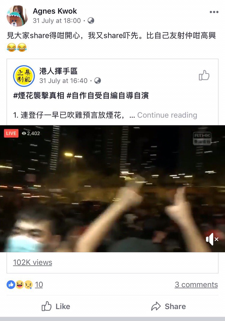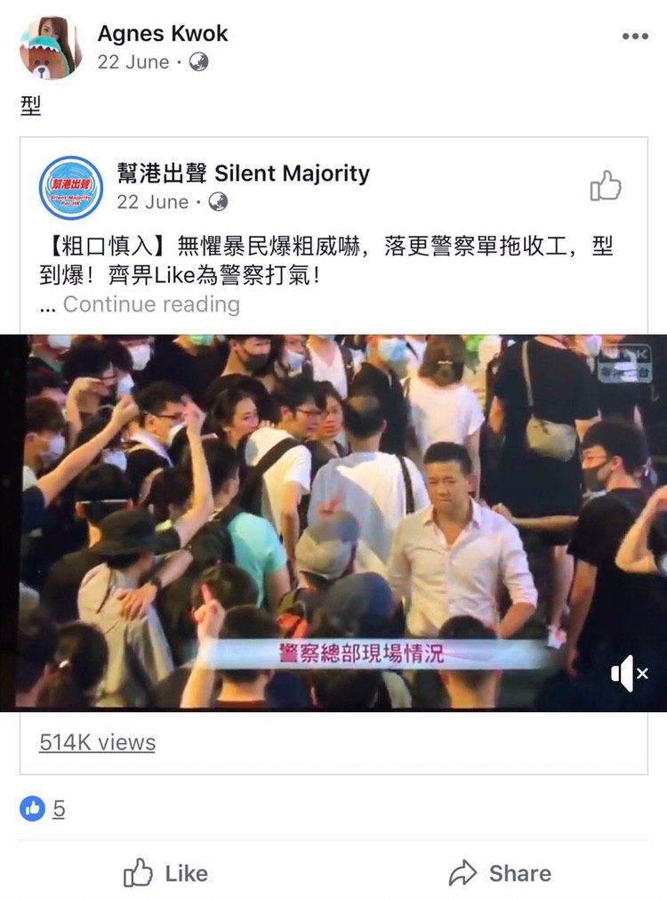 Agnes Kwok 係一名撐警藍絲,支持香港警察濫權濫捕並為此歡呼。