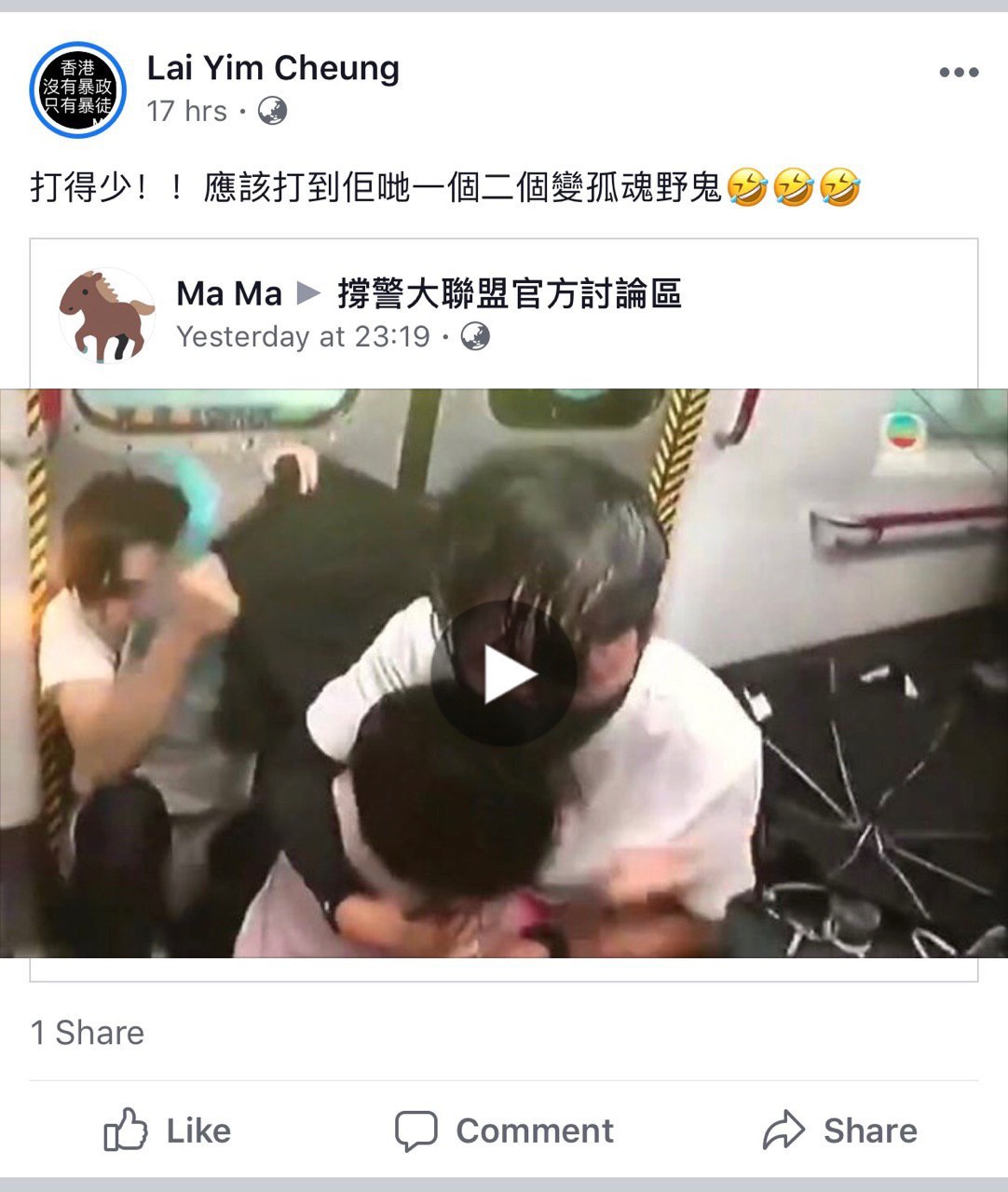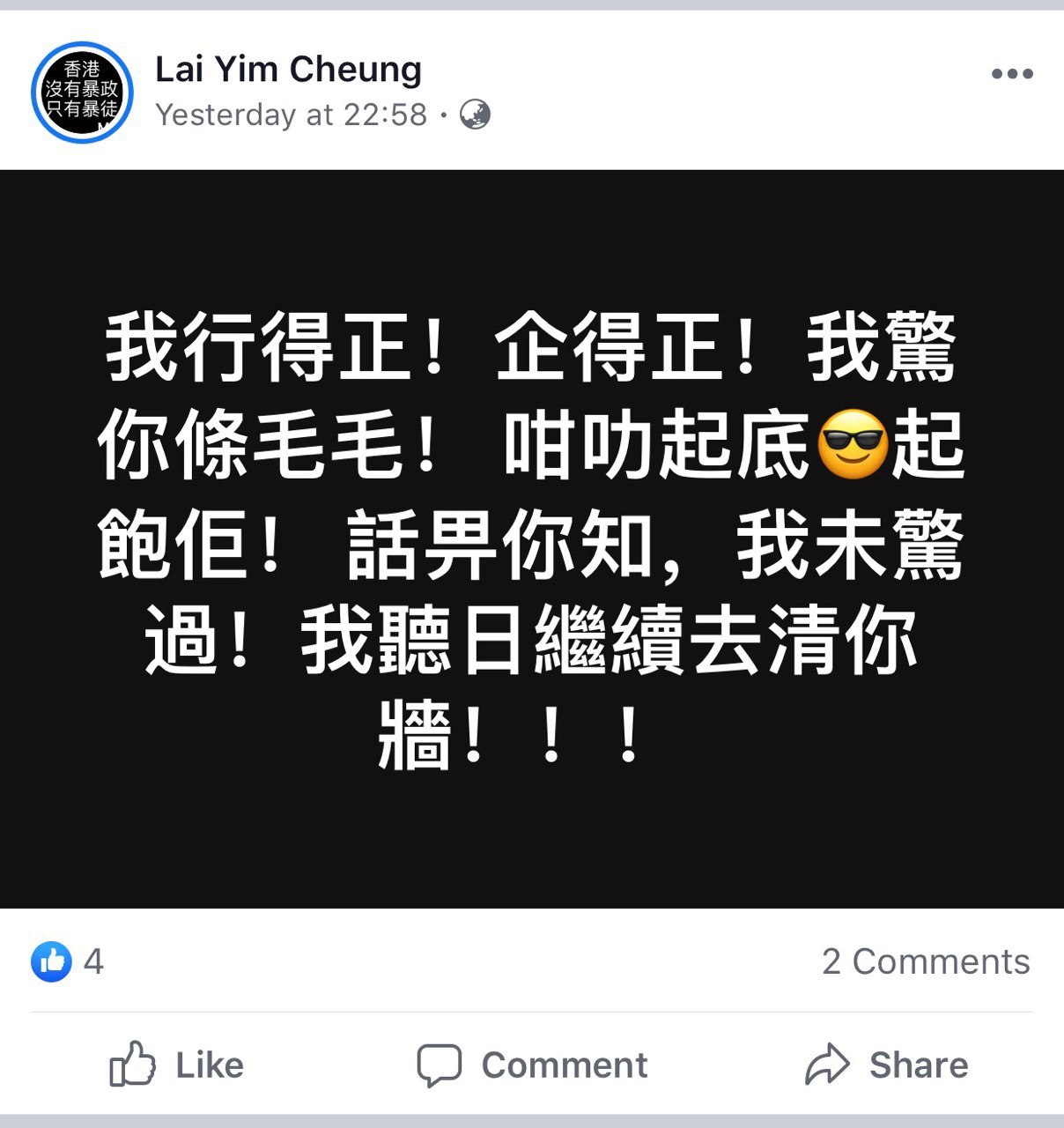 佢多次係Facebook發表親中撐警言論,包括支持元朗恐佈份子襲擊市民,支持警察入太子站瘋狂毆打市民,依加又聲稱要日日去摵連儂牆嘅宣傳品。佢宣稱唔怕俾人起底,但已經刪除佢兒子係網上嘅所有相片。