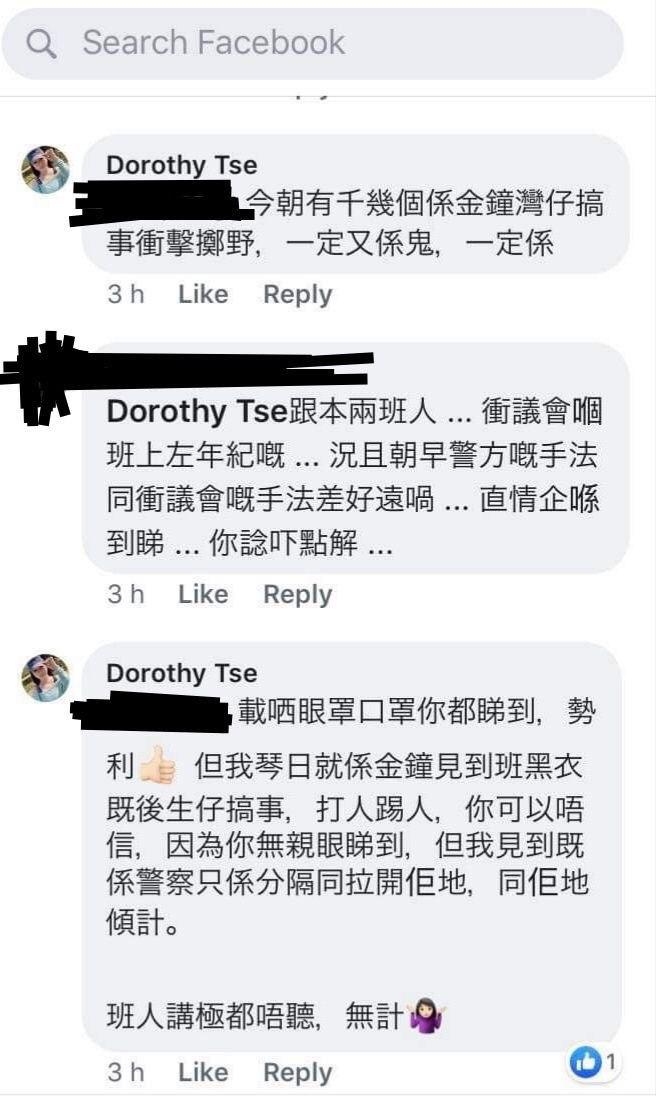 Dorothy Tse係一名撐警藍絲,支持香港警察濫權濫捕並為此歡呼。