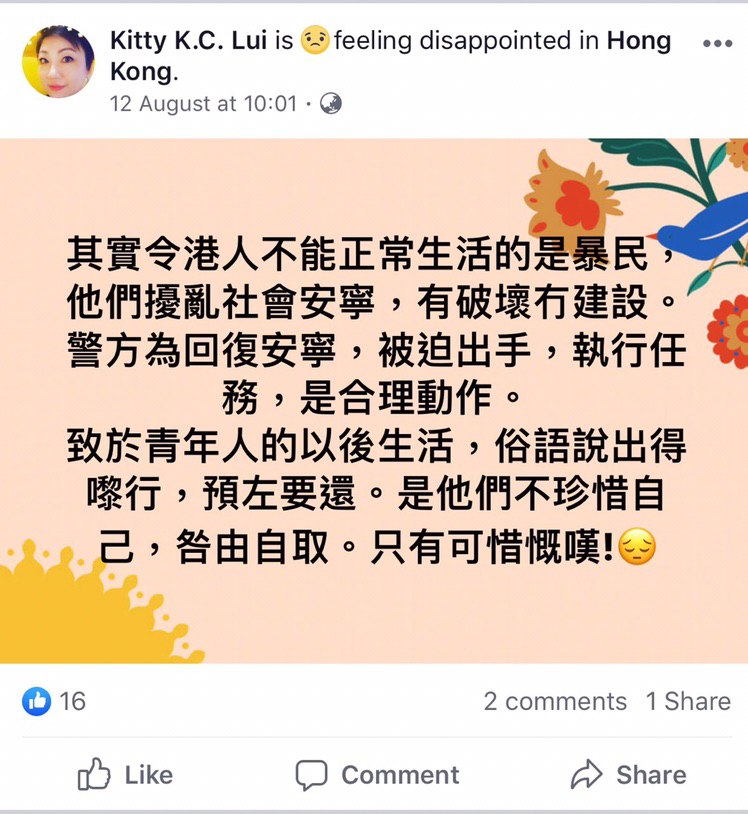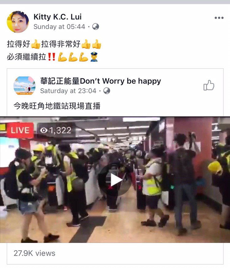 K.C. Lui Kitty係一名撐警藍絲,支持香港警察濫權濫捕並為此歡呼。