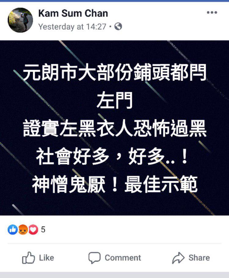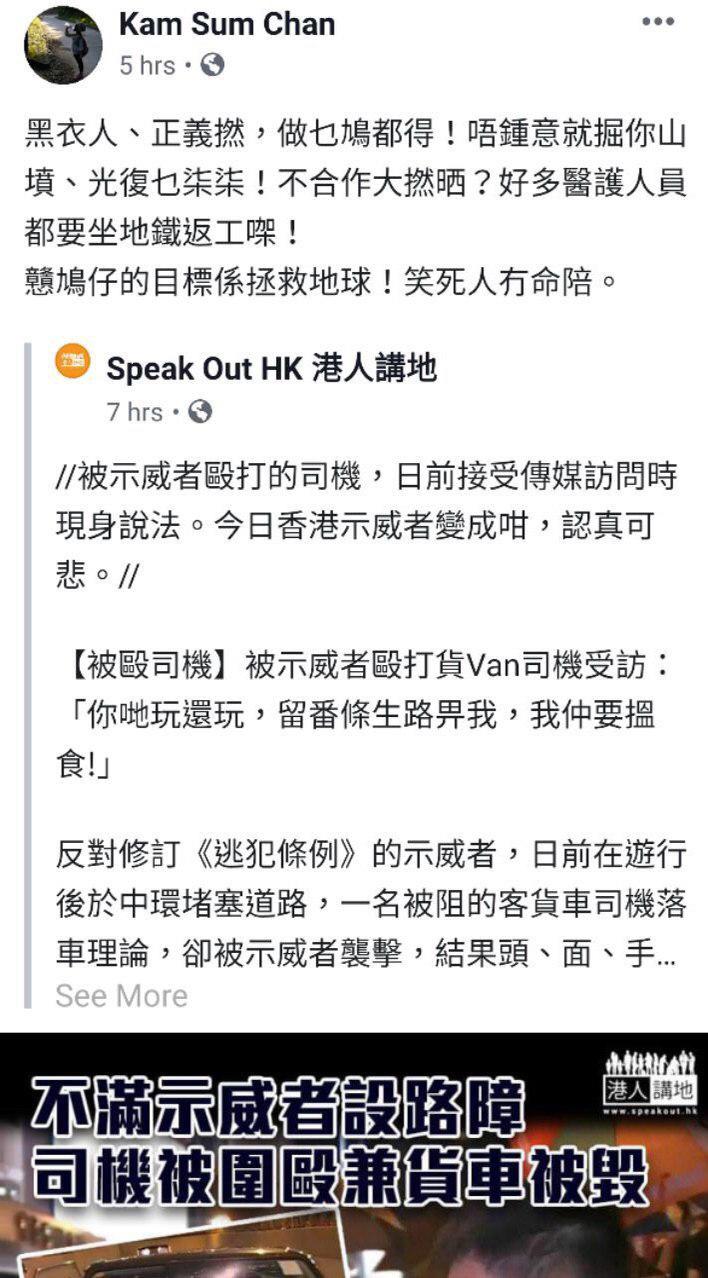 John Hui是親中派的一名成員或支持者。他曾經在Facebook發表親中言論,詳見下圖: