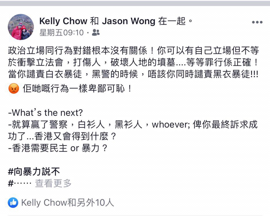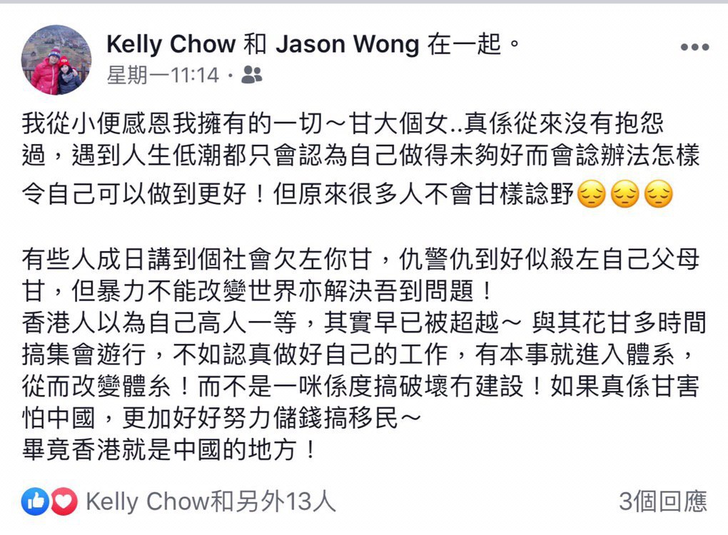 他曾經在Facebook發表親中言論,詳見下圖: