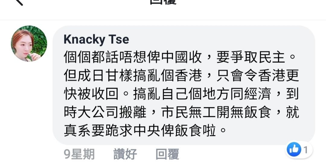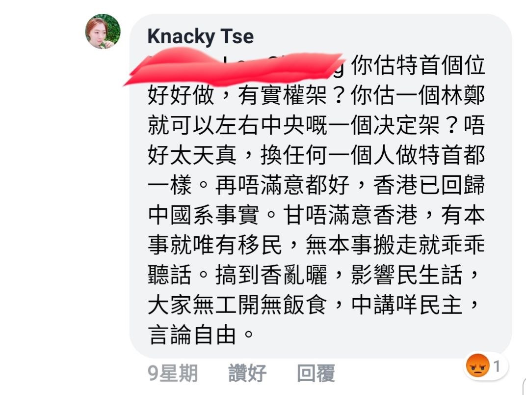 佢曾經係Facebook發表親中言論,要求不滿政府施政嘅人離開香港。