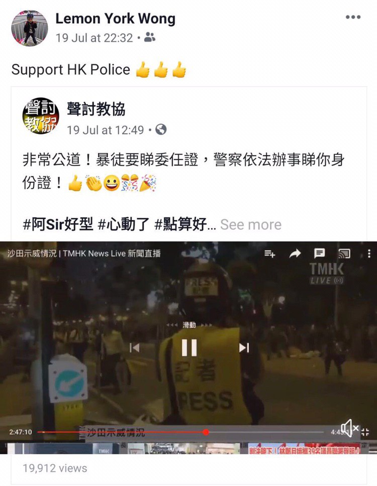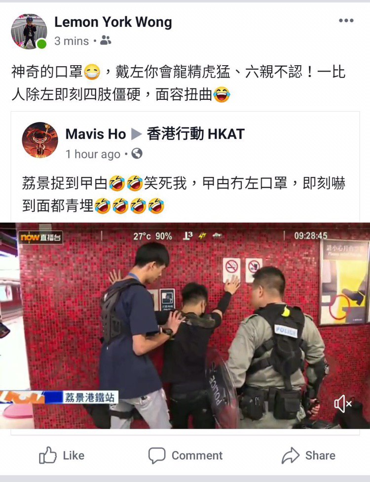 佢曾經係Facebook發表支持香港警察嘅言論,詳見下圖: