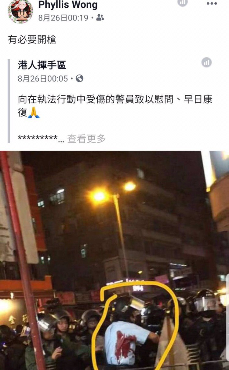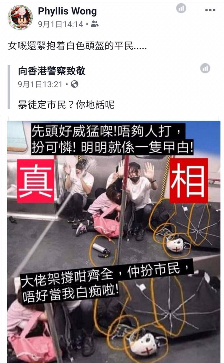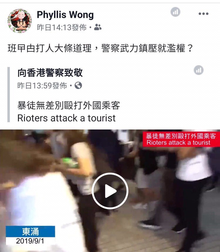 Phyllis Wong係一名撐警藍絲,支持香港警察濫權濫捕並為此歡呼。