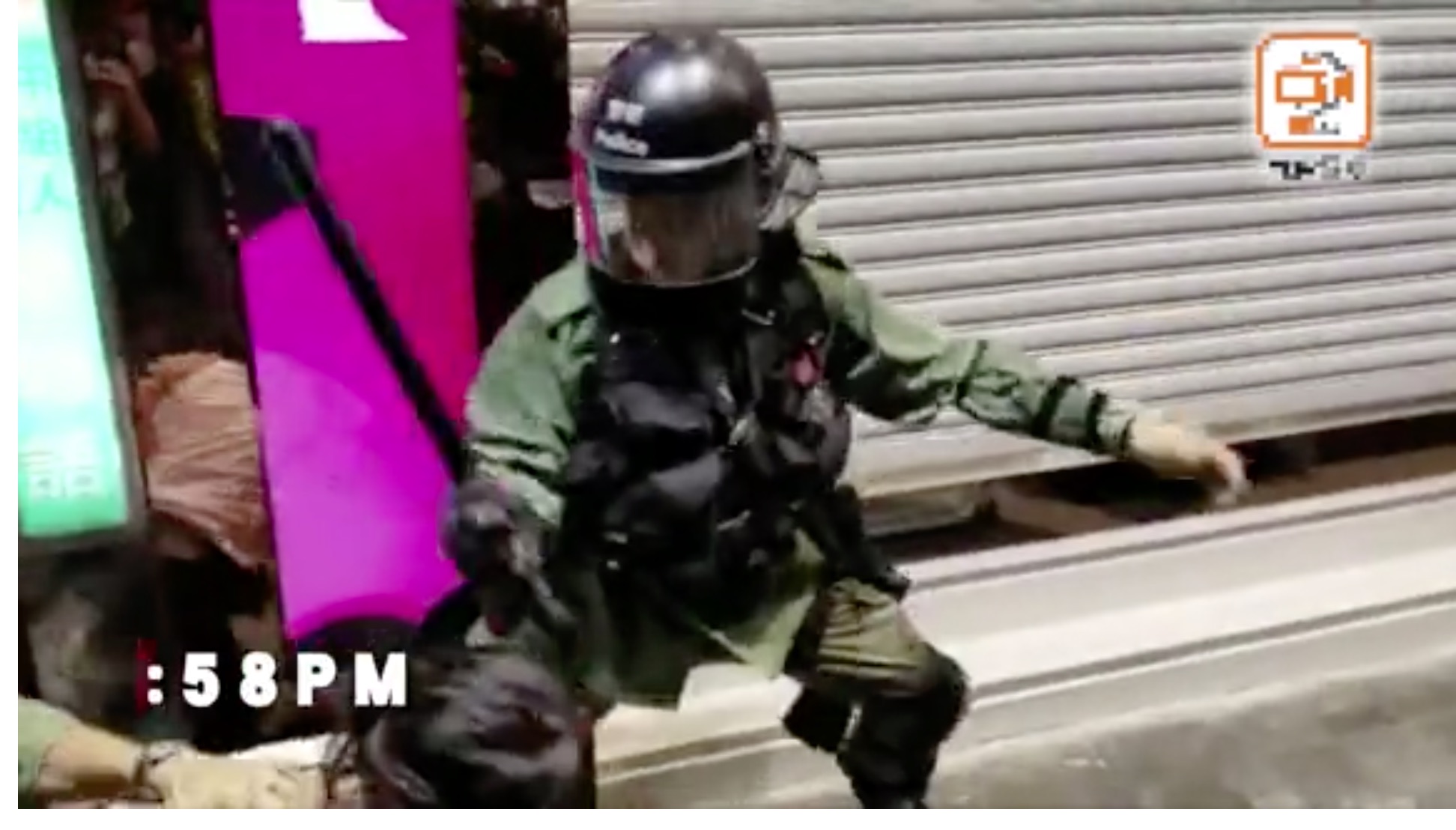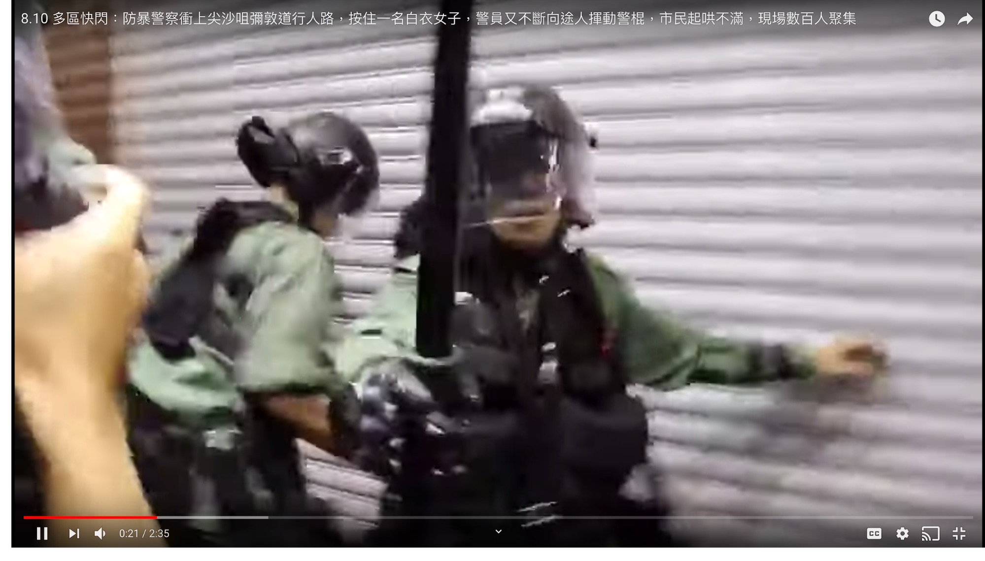 (e),0:06開始,可見警員用棍揮向途人。0:18,可見警員將女子撞往閘門。0:46開始持續約一分鐘,更多防暴警進入,並不斷將記者往外推。