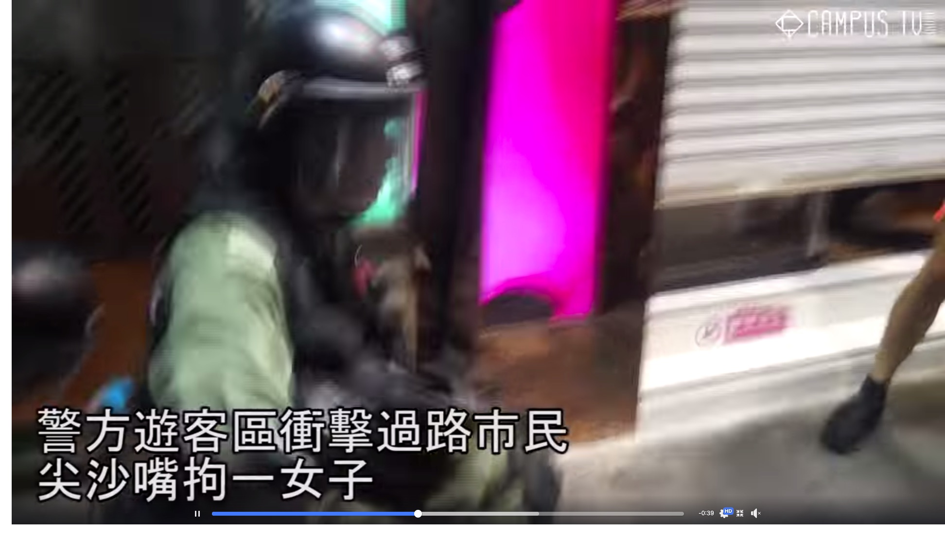 (a) 片段2:19可見,一群警員衝往行人路上的行,期間推倒一名記者,以及把一名沒有穿戴任何裝備的白衣女士撲往地上,及後又把該名女子撞向閘門。報導期間展出一張照片,看到有男警員騎在被捕的白衣女士身上。