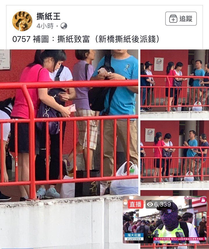 佢曾經協助他人係荃灣破壞各地連儂牆,並有份派錢俾破壞者。以下係派錢現場拍攝嘅相片: