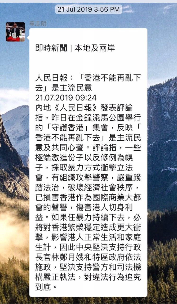 劉志輝是親中派的一名成員或支持者。他曾經在WhatsApp發表親中言論,例如在2019-07-21元朗恐襲時,表示示威者應該被汽車撞死。以下是更多相關的圖片: