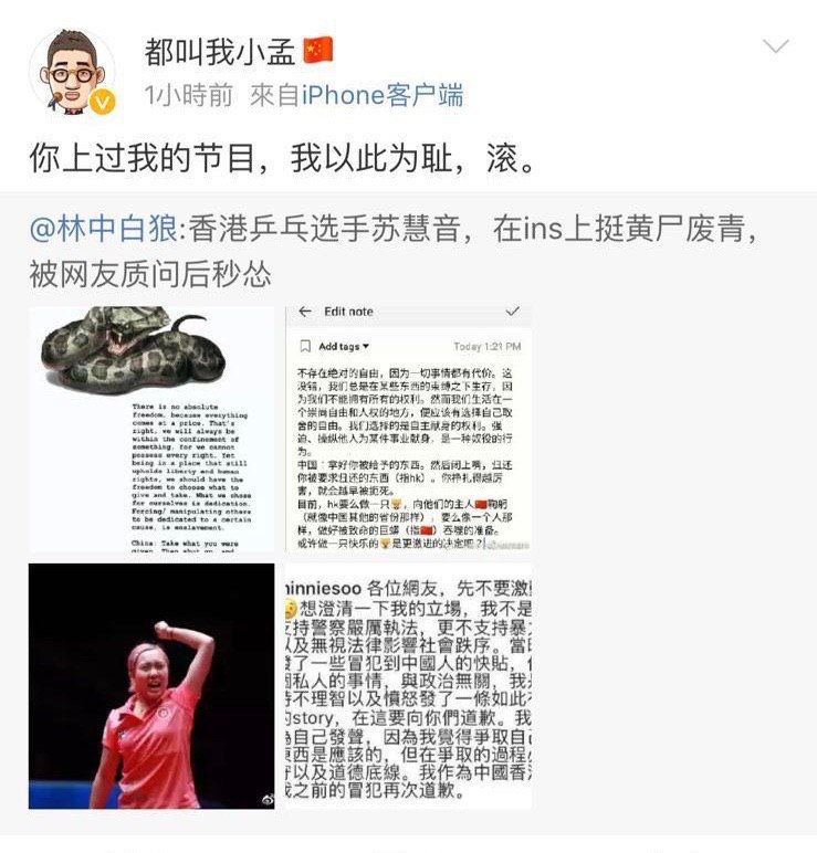 佢電台節目入面訪問過香港乒乓球手蘇慧音,之後喺微博話因為佢係黃絲以此為恥,詳見下圖: