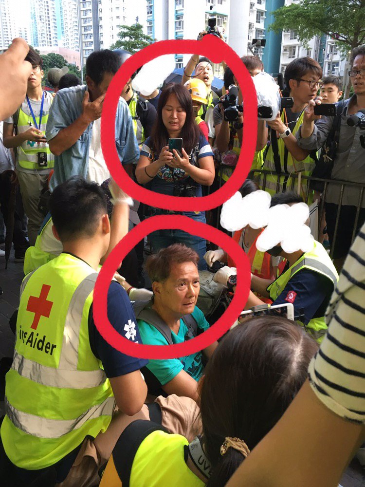 佢曾經係2019年9月14日,於九龍灣參加愛中國活動,並有份主動襲擊政見不同嘅人士。有社工表示可協助佢地離開,但佢地唔肯,堅持要等警察護送佢地,最後警察護送佢上警車離開,以下係現場圖片: