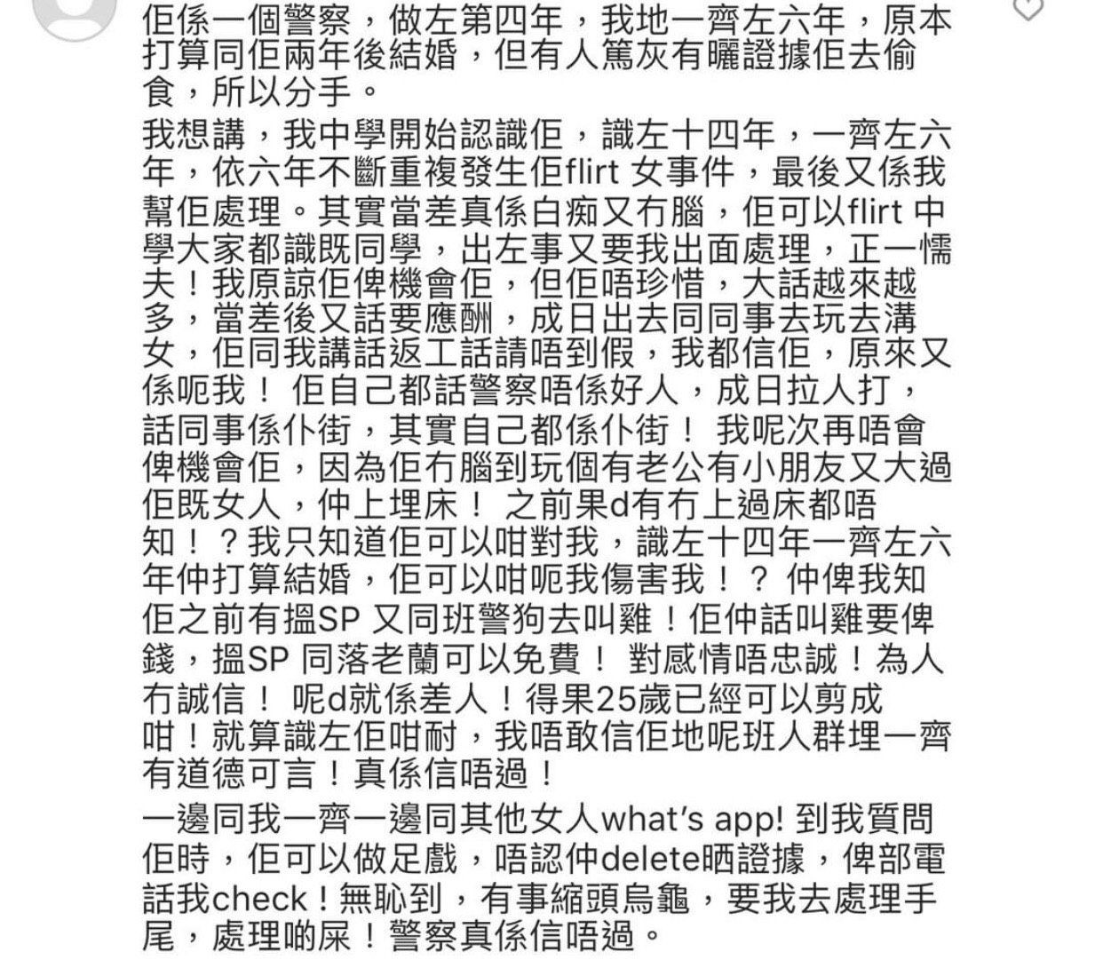 據一手資料指出,朱浩榮曾經話示威者係暴徒、抵死,但對外又稱警犬係「仆街」。佢又曾經係有女朋友嘅情況下,不停外出到蘭桂坊等地搵性伴、召妓。以下係佢前女友嘅聲明: