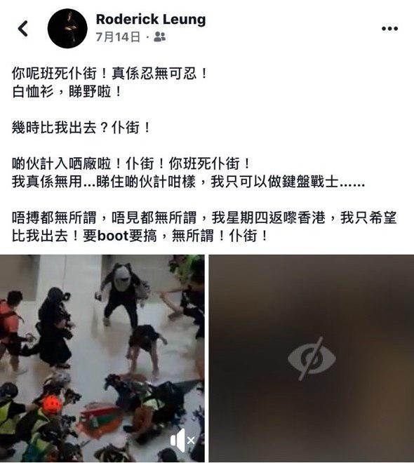 據知情人士指出,佢懷疑於2019年10月1日被淋腐蝕性液體,又曾多番係社交平台揚言要開槍射殺示威者。以下係佢於Facebook發表嘅言論: