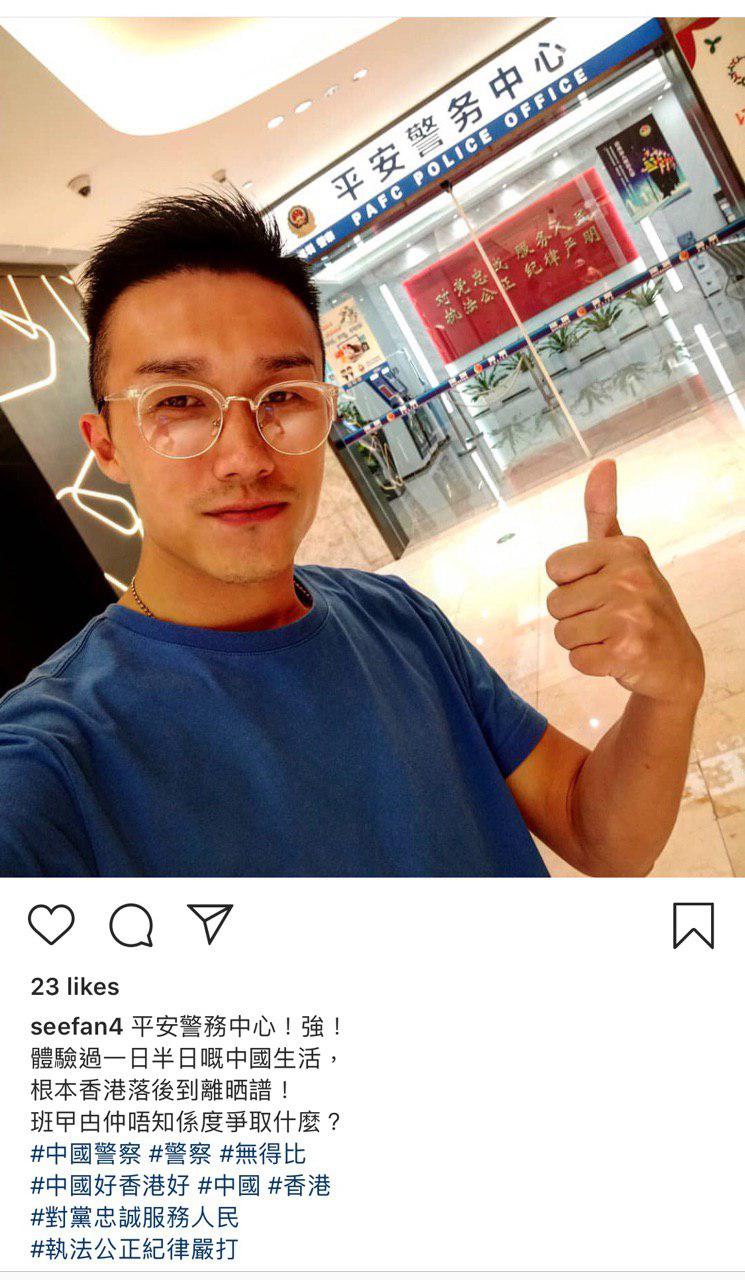 佢不斷係Facebook及Instagram發表親中及撐警言論鬧示威者,以及將個人資料圖片換成中國國安人員符國豪,以示支持符國豪係機場嘅行為,詳見下列圖片。