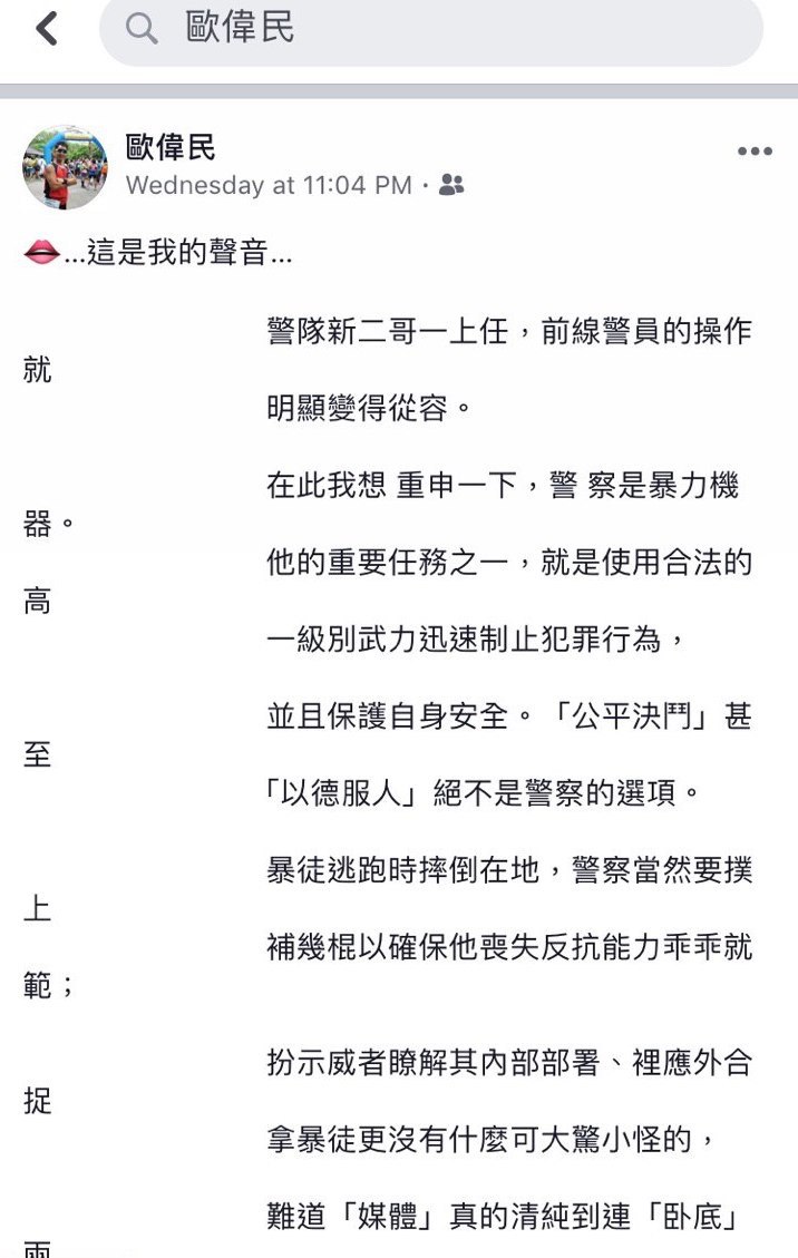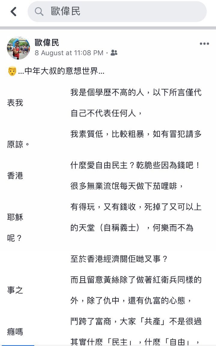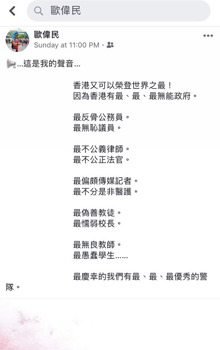 歐偉民係一名撐警藍絲,支持香港警察濫權濫捕並為此歡呼。