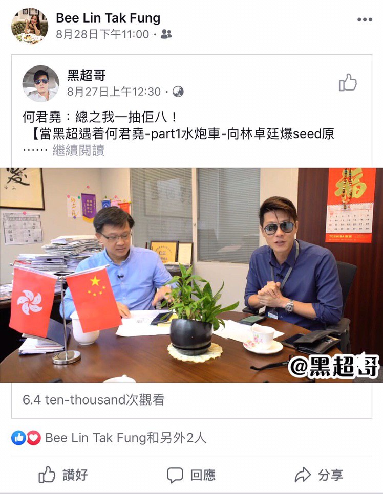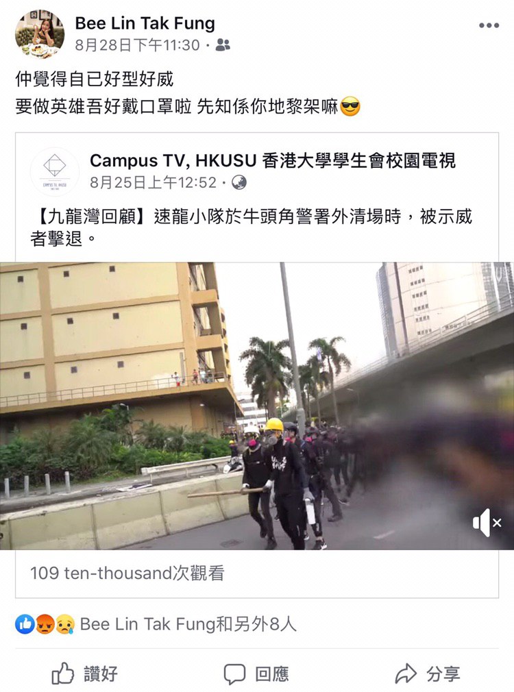 佢經常係Facebook轉發支持中國及香港警察嘅文章,詳見文底圖片。