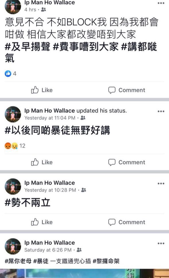 以下係佢係Facebook發表針對抗爭者嘅言論: