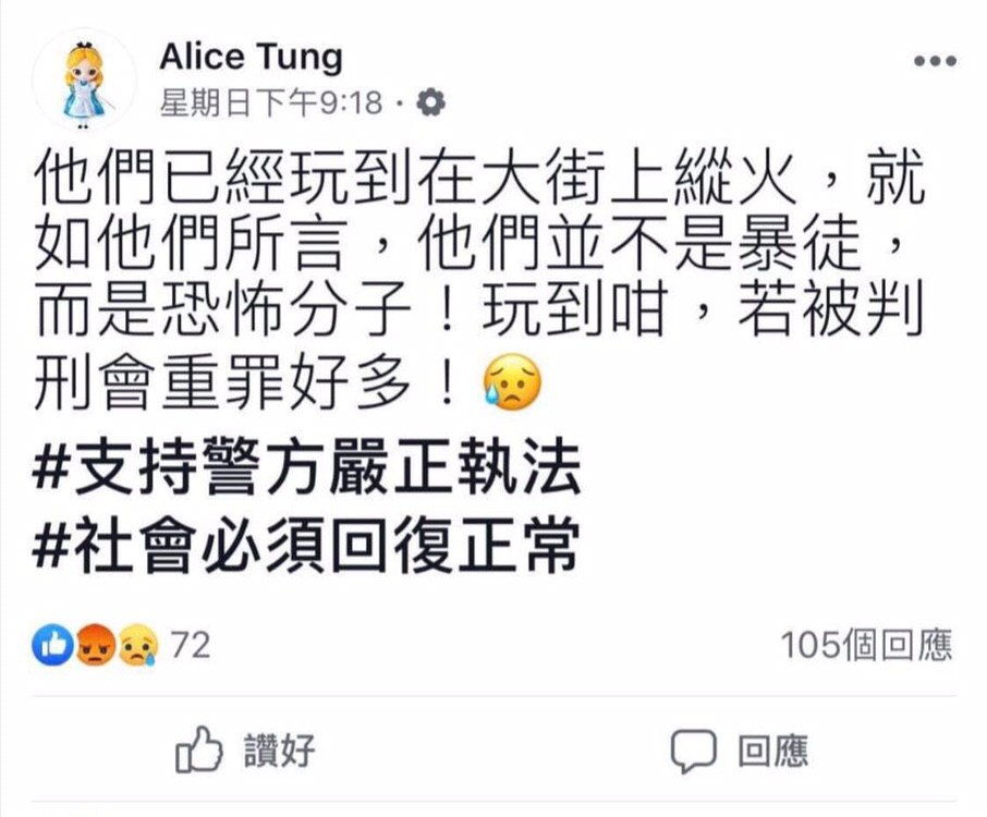 黃修賢係一名親中派嘅人。 佢不斷係Facebook上發表愛警言論,又轉發元朗恐佈份子集會現場片段,疑為恐襲分子一員。