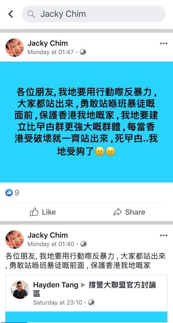 詹逸文係一名撐警藍絲,支持香港警察虐待示威者。