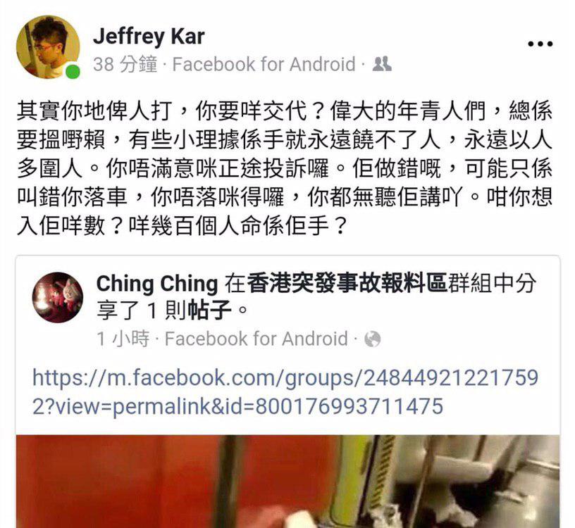 佢曾經係Facebook支持港鐵係元朗恐襲嘅不合當處理手法。