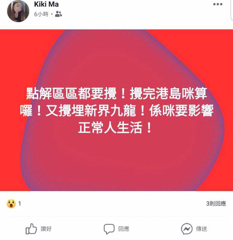 佢曾經係Facebook指責示威者四處生事。