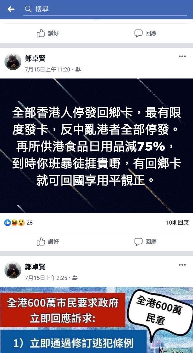 他曾在Facebook上發表親中言論,詳見下圖:
