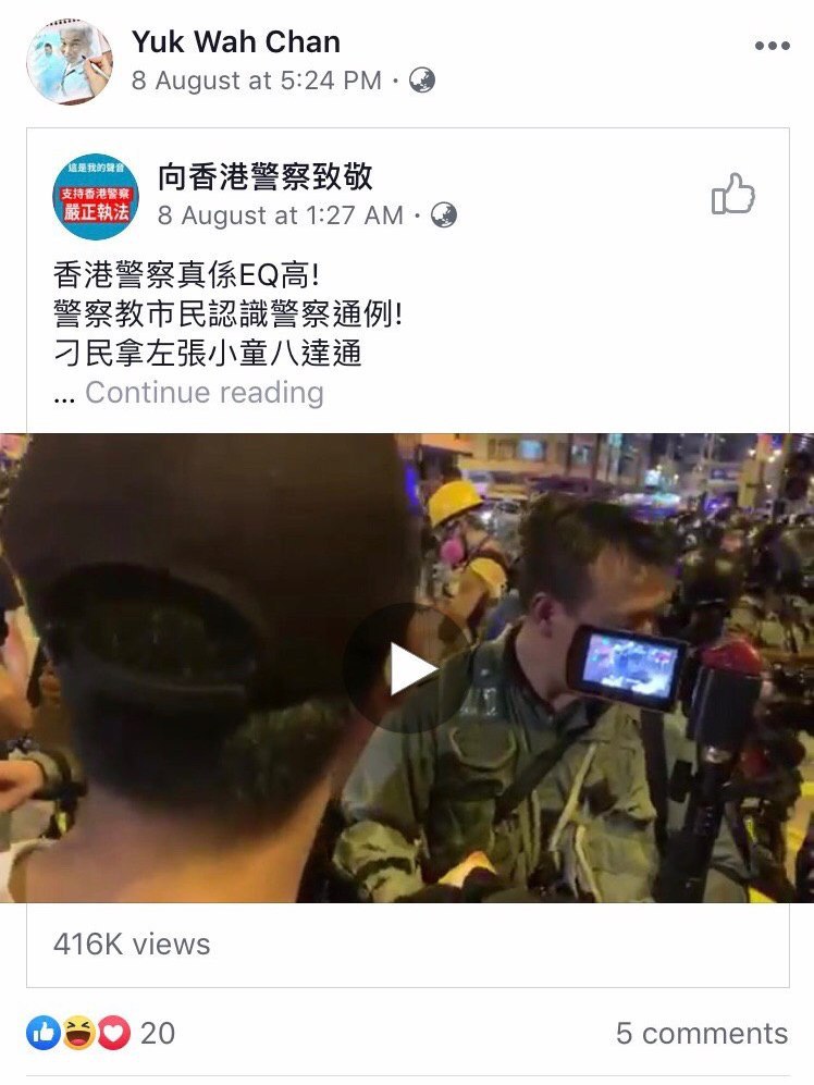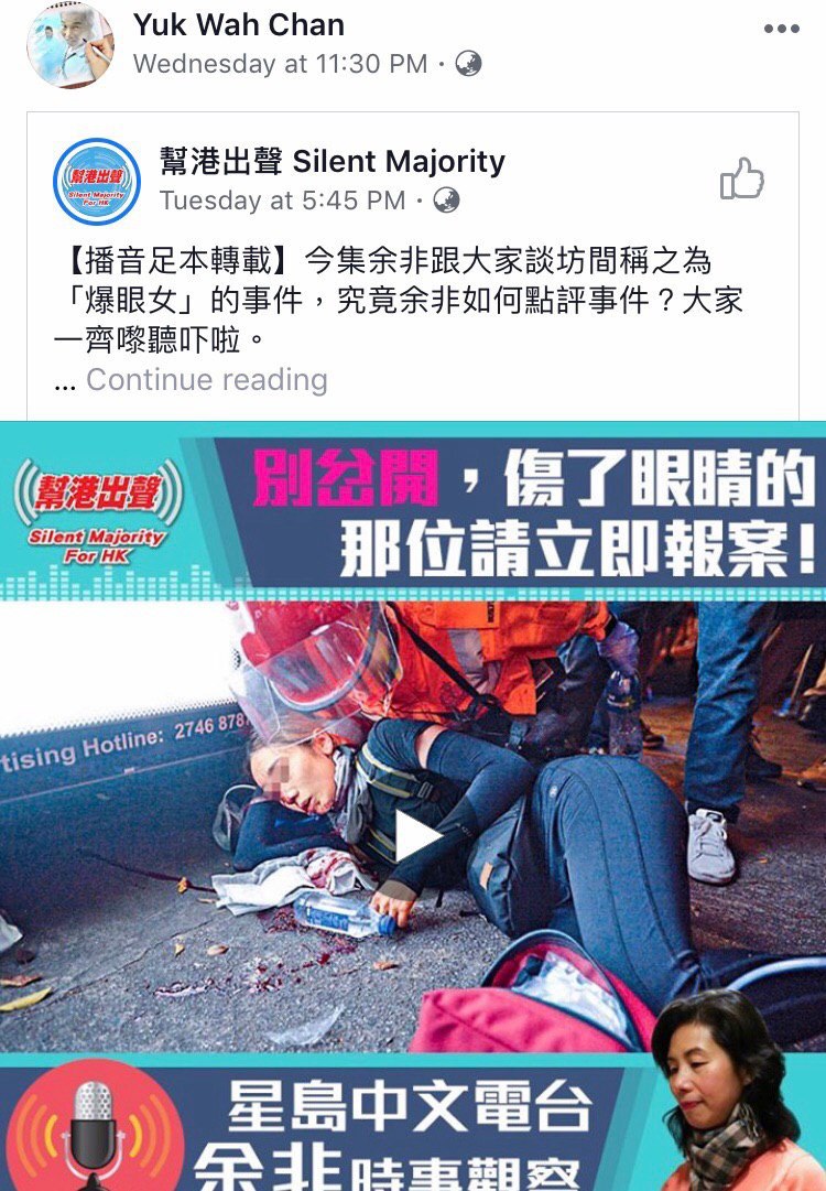 佢多次係Facebook協助轉發藍絲post,當有人表示不贊同其言論,會先鬧人後刪除文章。