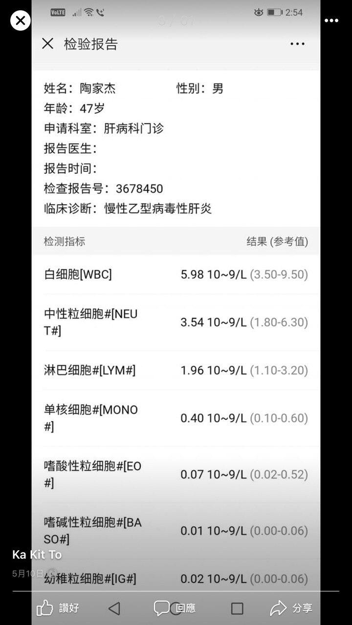 根據中國醫療機構報告,佢患有乙型肝炎,詳見下圖: