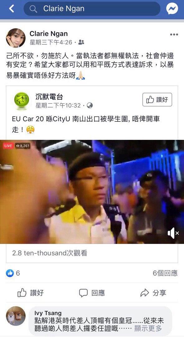 佢曾經多次係Facebook發表支持親中撐警嘅言論,詳見下列圖片。