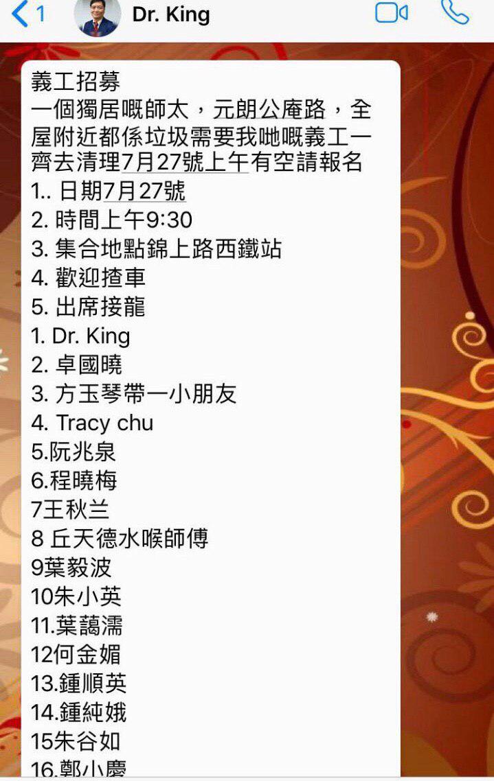佢曾經組織他人「清理」元朗區嘅垃圾,包括剷除連儂牆嘅反送中相關宣傳品及襲擊附近市民。
