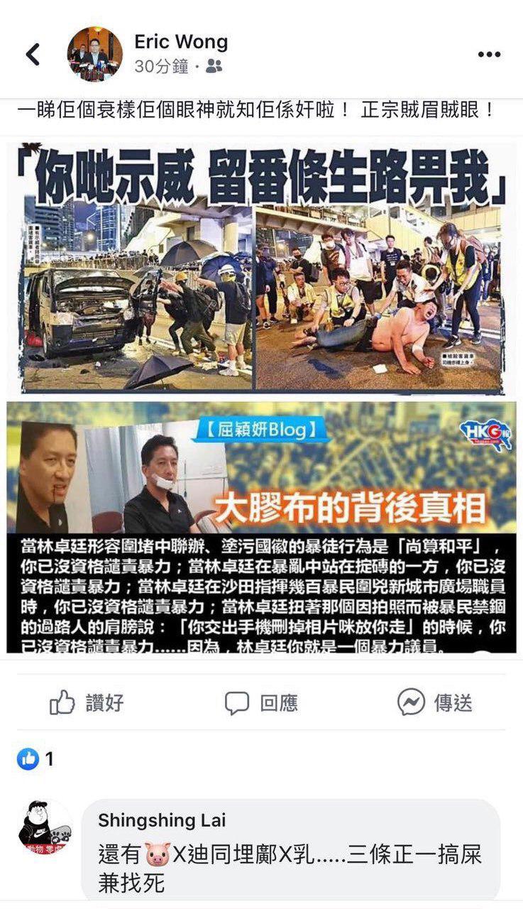 佢曾經係Facebook轉發極端親中媒體抹黑泛民主派議員嘅資訊。